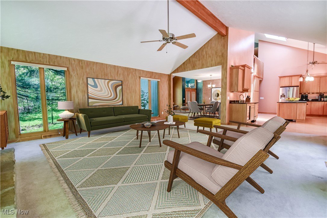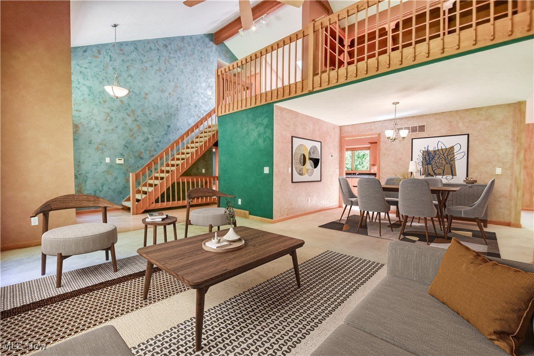 Dramatic ceilings with exposed beams and massive windows