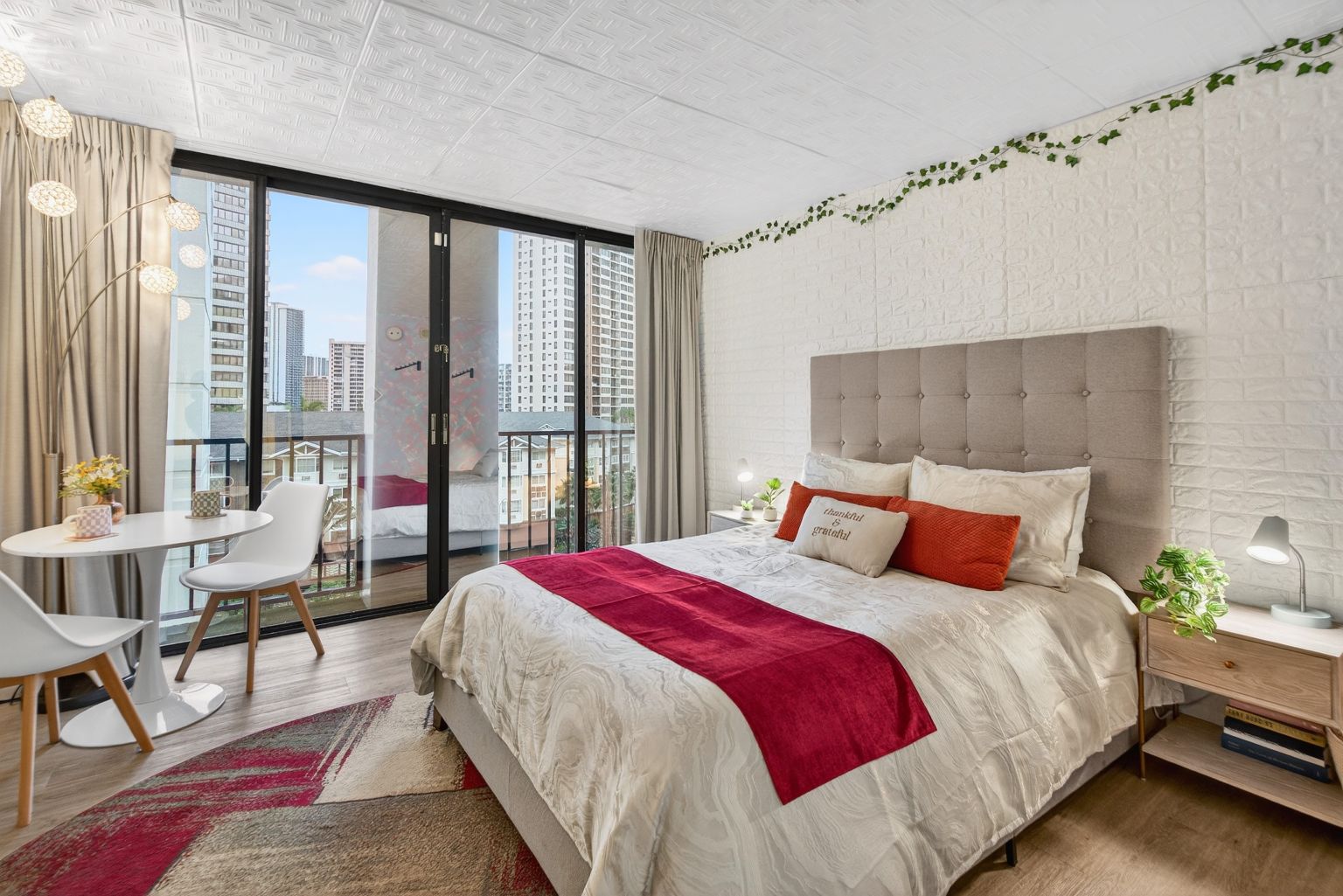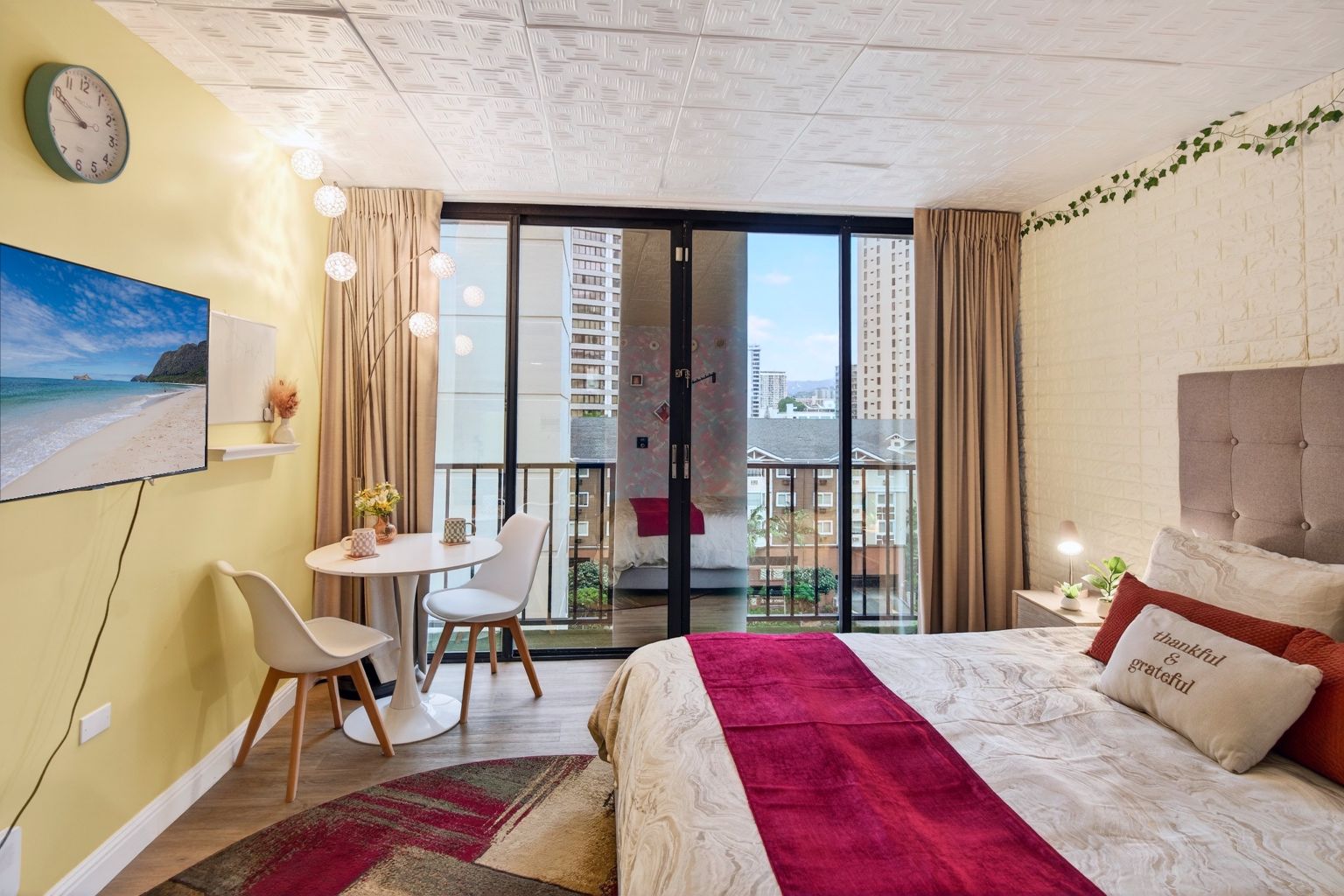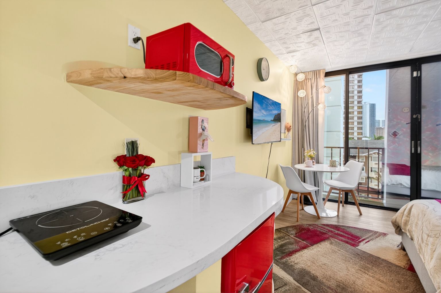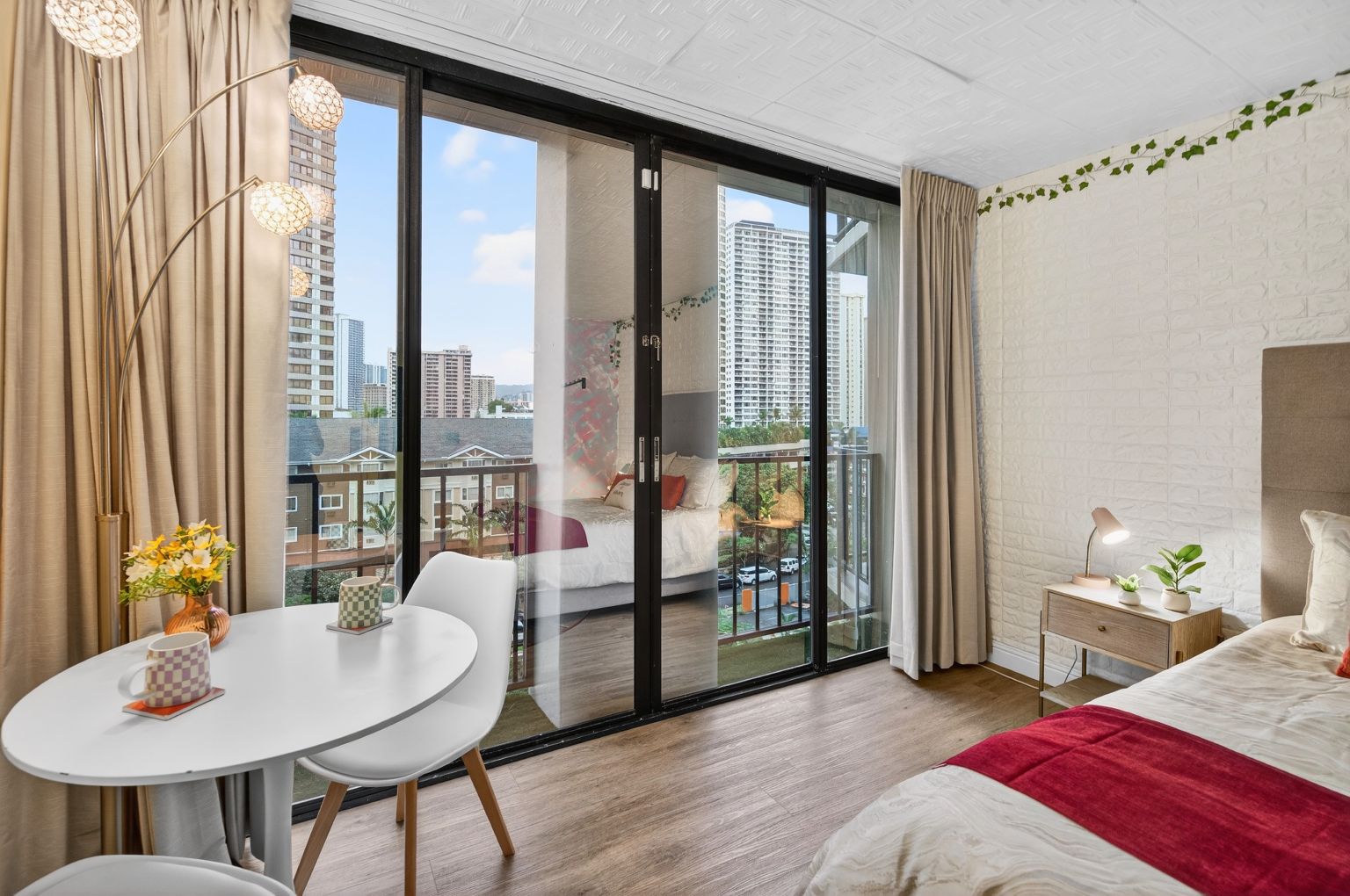 Thoughtfully designed with a bright, open layout, the unit features a cozy sleeping area, a functional kitchenette, and a charming dining nook that opens to a private lanai. Large sliding glass doors bring in natural light and city views, creating a welcoming and airy atmosphere. The tastefully updated bathroom showcases modern finishes and playful design elements that add character and style.