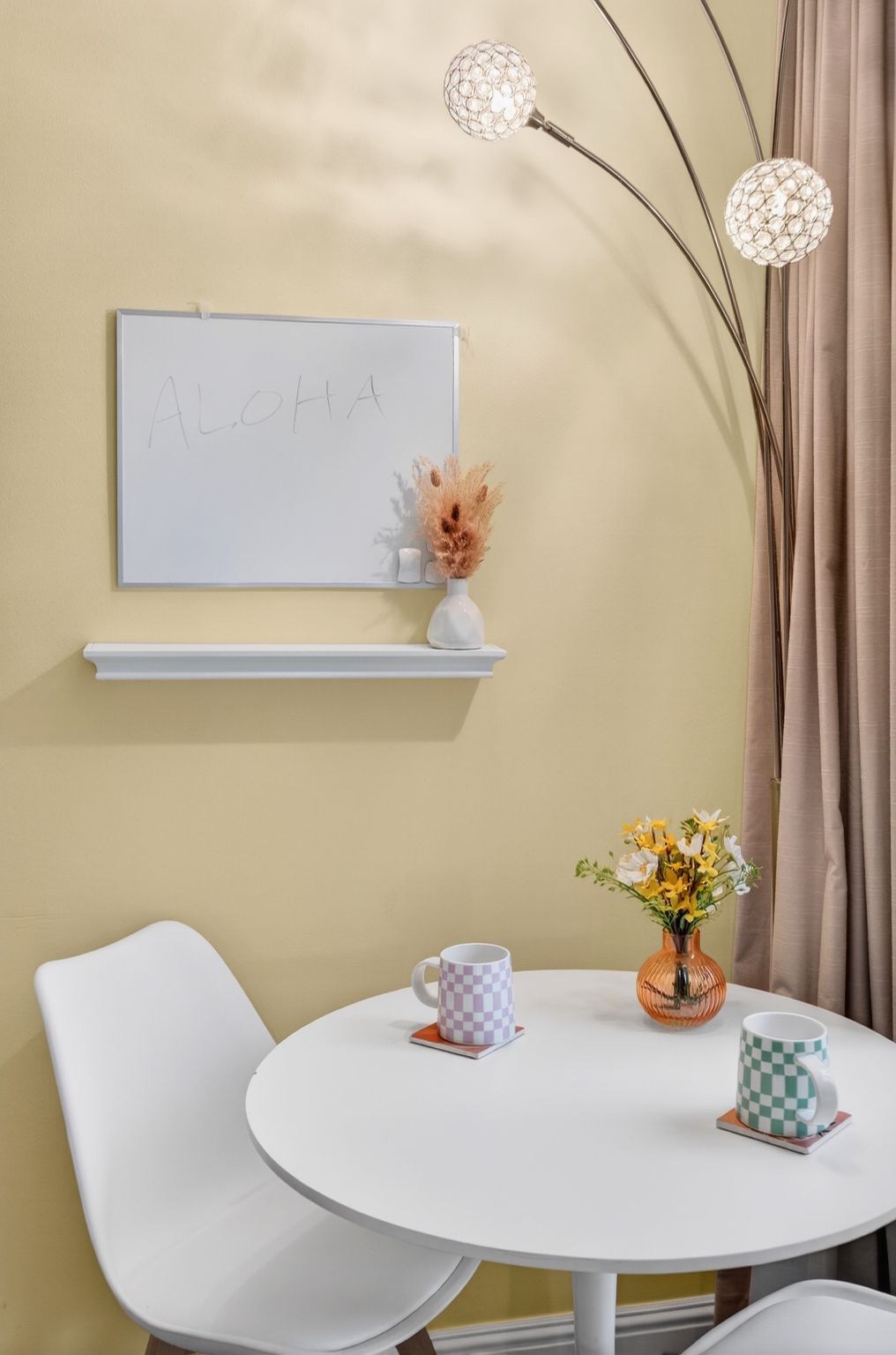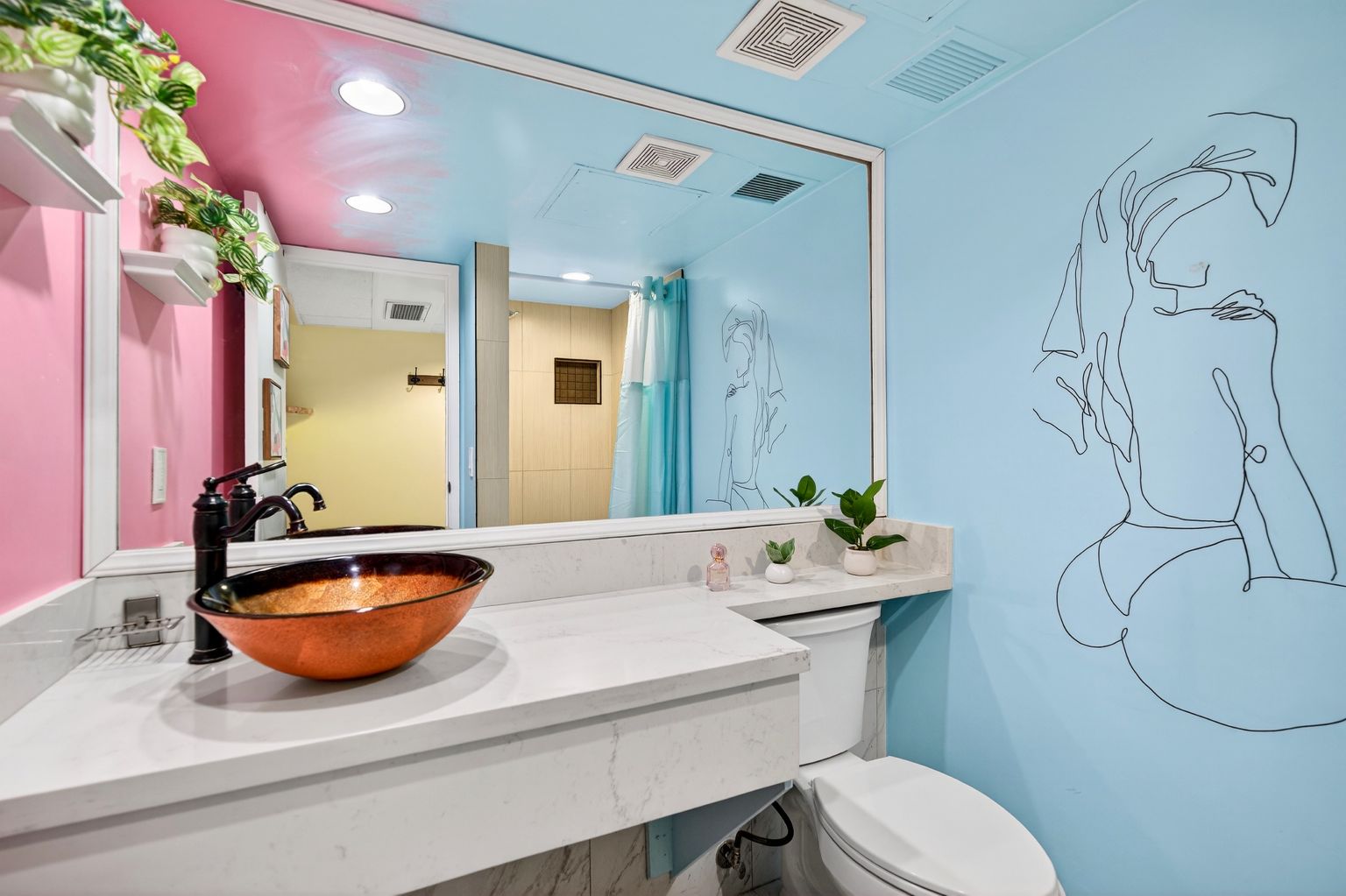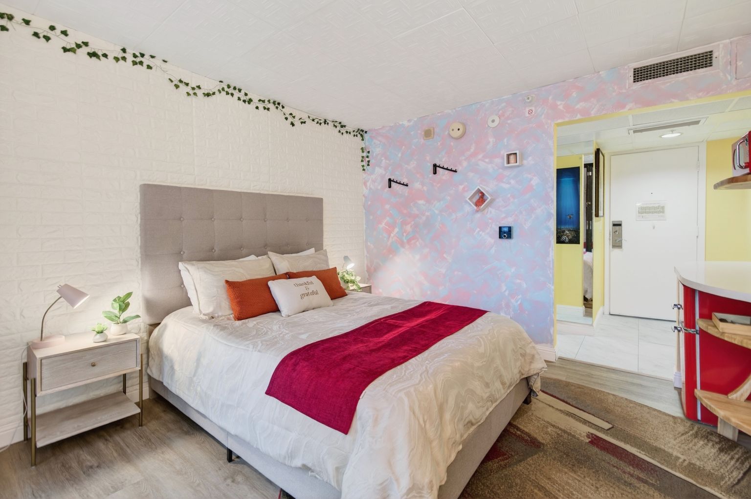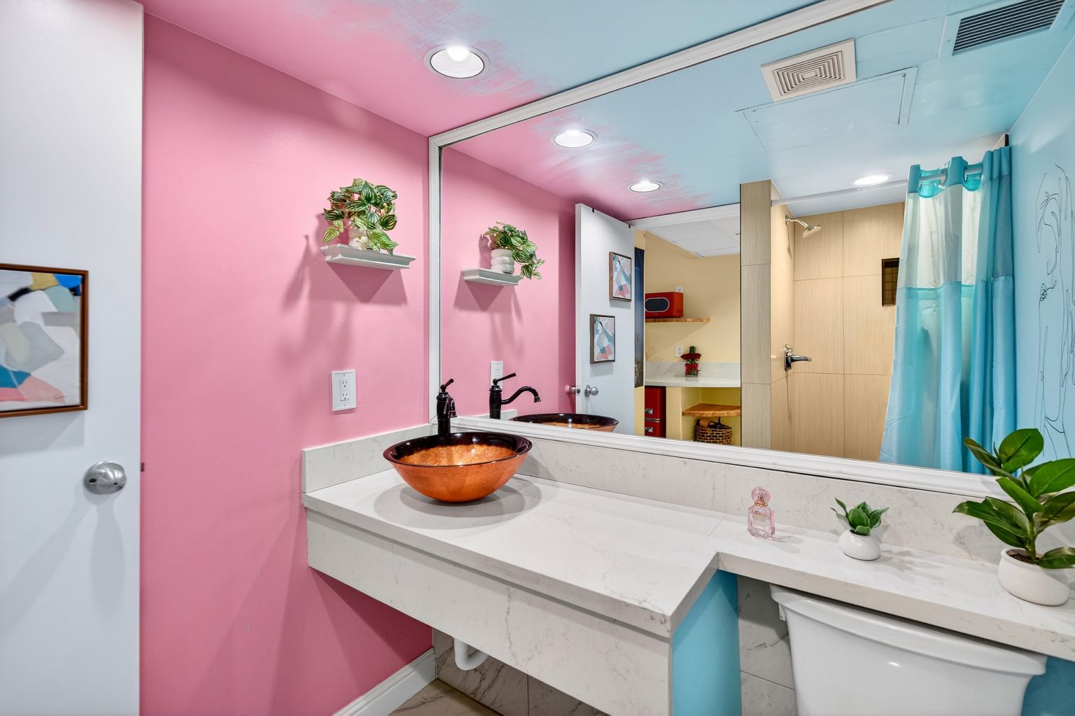 Thoughtfully designed with a bright, open layout, the unit features a cozy sleeping area, a functional kitchenette, and a charming dining nook that opens to a private lanai. Large sliding glass doors bring in natural light and city views, creating a welcoming and airy atmosphere. The tastefully updated bathroom showcases modern finishes and playful design elements that add character and style.